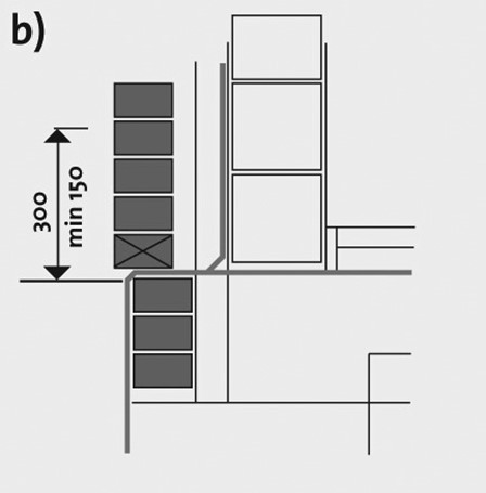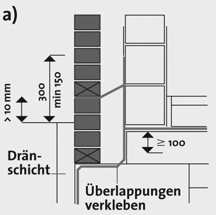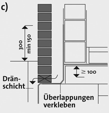 Eine Regelabdichtung gemäß DIN 18195-4, Abschnitt 6.1.1, stellt die Variante b) dar. Diese Ausführung findet jedoch in Norddeutschland kaum Beachtung. Denn bei zweischaligen Außenwänden beginnt die Verblendschale aus optischen Gründen meist unterhalb der Geländeoberfläche. Für diesen all kann daher nur die Variante c) empfohlen werden, die eine erhebliche Vereinfachung bei Sockelabdichtung von zweischaligen Außenwänden darstellt.
